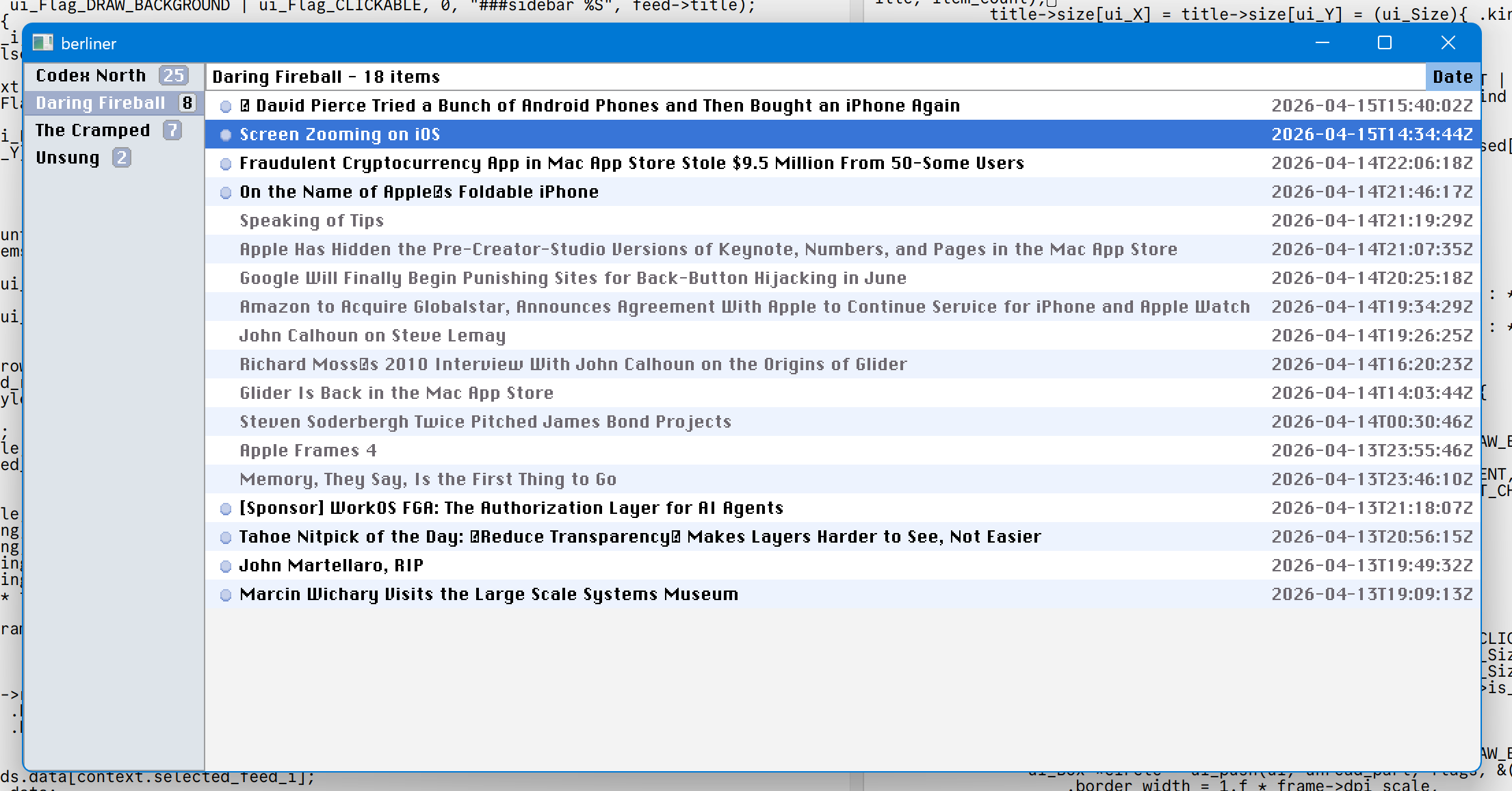 some initial work on &berliner, an RSS reader. need to tackle UTF8 next. fun!